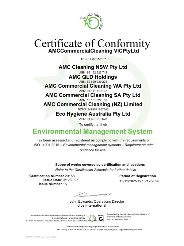 AMC Commercial Cleaning holds the prestigious triple quality certification โ meaning that our company complies with ISO standards for Environment Standards, Quality Management and Work Health and Safety. This translates to an exceptional level of service for our clients, and one that is industry leading in New Zealand.
